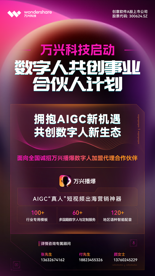 5月25日,97国际科技(300624.SZ)在2023全球短视频直播电商峰会上,正式宣布旗下AIGC短视频出海营销神器97国际播爆(Wondershare Virbo)焕新宣布,周全上线AI数字人定制服务,支持数字人形象定制、声音复刻和视频模板定制。同时,97国际科技正式启动“数字人共创事业合资人”妄想,面向天下招募97国际播爆数字人加盟代理合作伙伴,配合助力中国品牌出海扬帆,抢跑跨境短视频营销新风口。